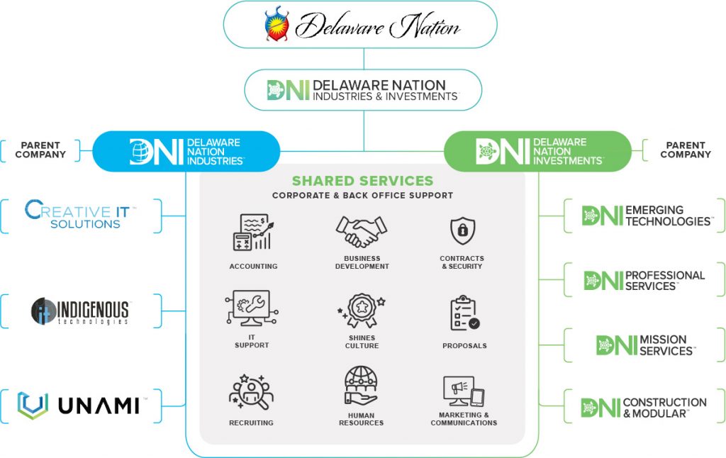 Delaware Nation Industries & Investments is an award-winning family of businesses that are wholly owned by the Delaware Nation. DNI’s vision is to provide a dependable stream of revenue to the Delaware Nation with the purpose of creating financial independence for the Tribe while empowering its Citizens to sustain the SHINES culture and continue the legacy of entrepreneurship.
